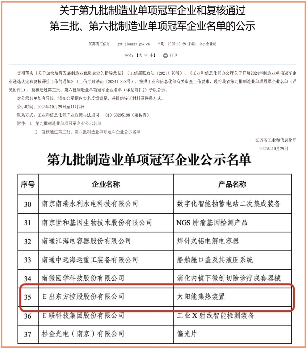 近日,江苏省工业和信息化厅公布了第九批制造业单项冠军企业名单,日出东方控股股份有限公司凭借在清洁能源热应用领域的卓越表现,荣膺“国家级制造业单项冠军企业”称号。这一殊荣不仅是对日出东方技术实力与市场地位的权威认可,更是对其二十余年来专注于清洁能源领域不懈探索与创新的充分肯定。